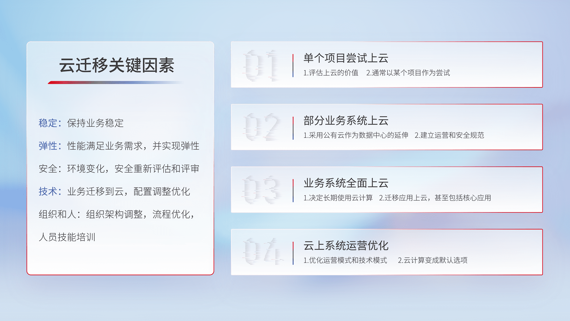 结合实际业务,,从规划设计、、、、云平台选型、、云原生改造、、、数据迁移、、、集成交付,,迁移全过程为客户识别最佳上云路径,,做好风险识别管理,,,设计网络架构、、、身份权限、、、安全审计合规、、、操作审计、、、、日志审计、、监控告警策略、、、多站点容灾设计等,,,,对云上基础设施进行整体规划,,,,提升IT治理水平,,,以满足弹性、、、、高可用、、高性能的需求。。