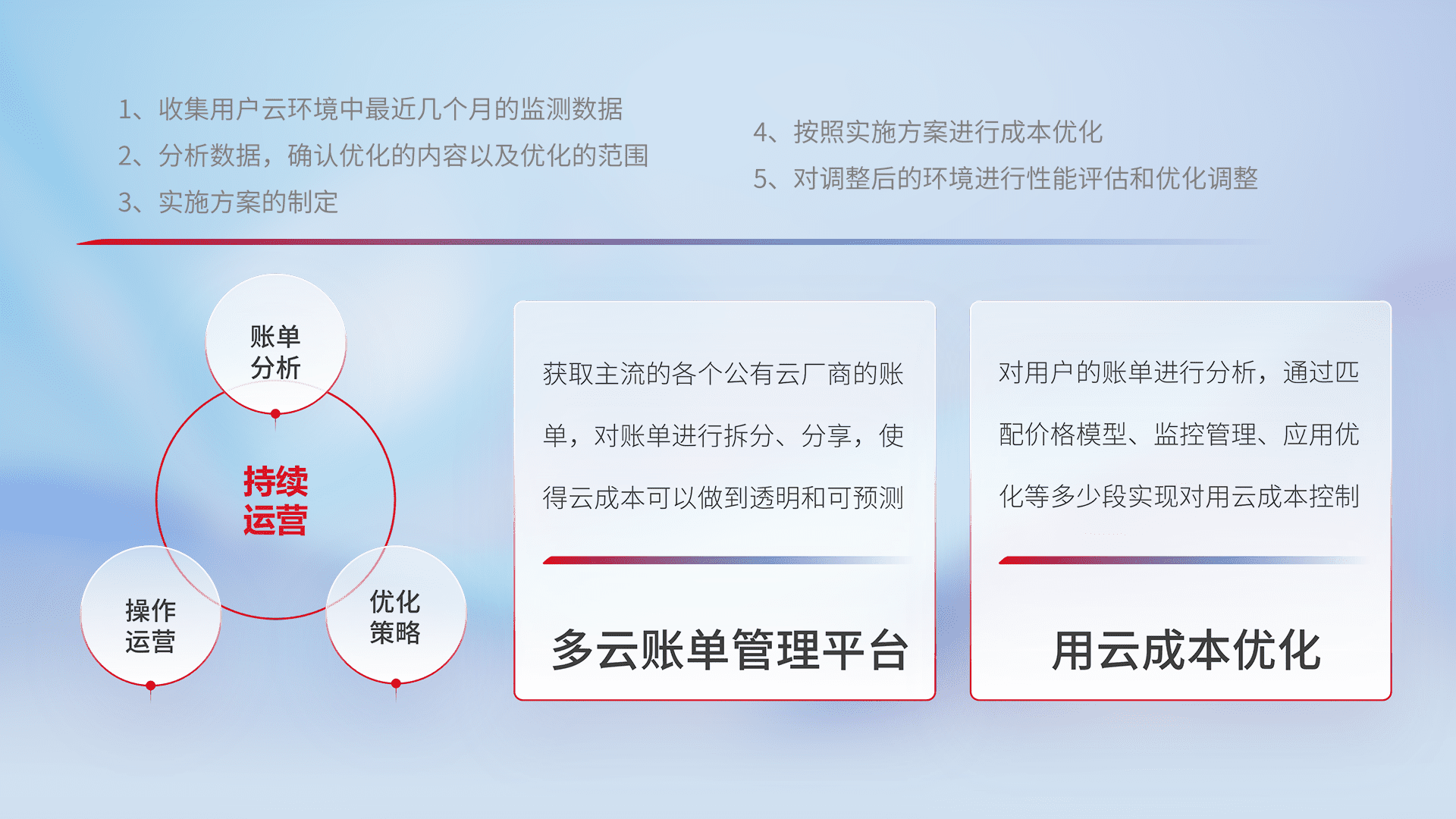 通过多云纳管,,以统一的资源数据模型把客户的云资源进行抽象和封装,,,,进而实现对多云资源的统一操作,,保障云资源管理的可靠性、、、稳定性与可用性。。。量身定制化运维内容,,,配置、、、、开发运维、、补丁管理、、、、备份、、监控、、、、认证和访问管理、、审计和日常巡检等,,,,保障在用云过程中的可靠度,,稳定度以及高可用率。。。