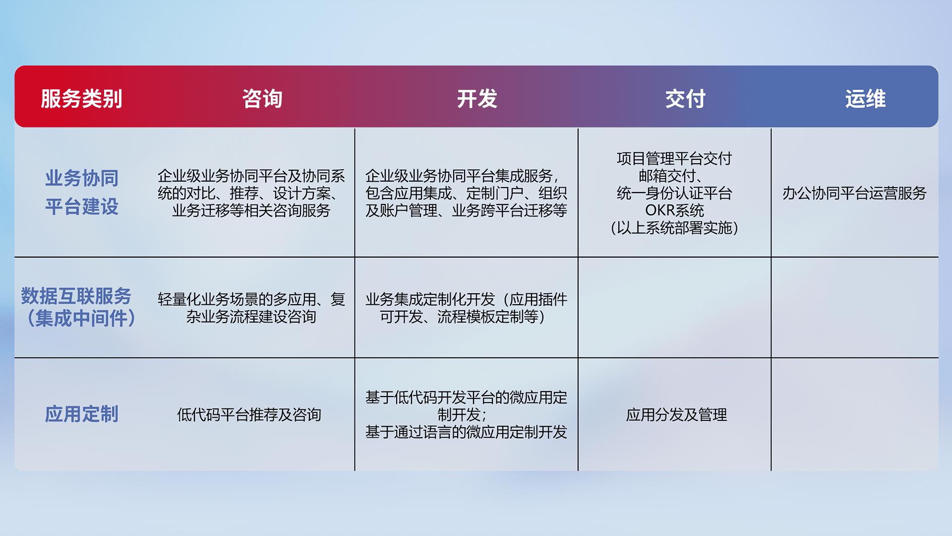针对钉钉、、、企微、、IDaas等平台级产品提供产品的规划、、、、方案、、、、交付、、、定制化开发等服务,,实现如统一协同办公、、、、智能客户服务、、、、混合会议管理、、智能数据查询、、等业务场景,,,,实现数字化转型。。。。